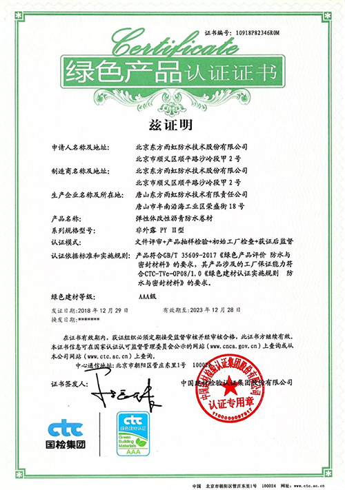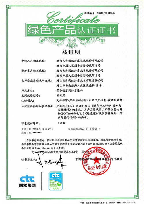 日前,中國(guó)建材檢驗(yàn)認(rèn)證集團(tuán)(以下簡(jiǎn)稱:國(guó)檢集團(tuán))向東方雨虹頒發(fā)了首批綠色產(chǎn)品認(rèn)證證書。 依據(jù)GB/T 35609-2017《綠色產(chǎn)品評(píng)價(jià) 防水卷材與密封材料》的要求,國(guó)檢集團(tuán)對(duì)東方雨虹工廠保證能力要求、產(chǎn)品一致性控制及綠色評(píng)價(jià)要求符合性等方面進(jìn)行了嚴(yán)格的現(xiàn)場(chǎng)檢查與抽樣檢驗(yàn),東方雨虹此次申報(bào)的“彈性體改性瀝青防水卷材(非外露 PY Ⅱ型 )”和“聚合物水泥防水涂料(非外露)”兩類產(chǎn)品獲綠色產(chǎn)品認(rèn)證證書。