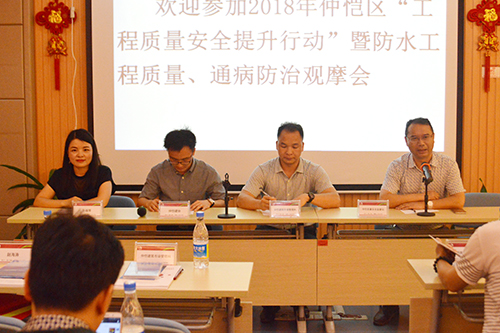 5月31日下午,由惠州市仲愷高新區(qū)住房和城鄉(xiāng)規(guī)劃建設(shè)局主辦,惠州仲愷高新區(qū)建筑行業(yè)協(xié)會(huì)協(xié)辦,廣東東方雨虹防水工程有限公司承辦的“工程質(zhì)量安全提升行動(dòng)”暨防水工程質(zhì)量、通病防治觀摩會(huì)在東方雨虹惠州生產(chǎn)基地召開(kāi)。仲愷區(qū)建設(shè)工程質(zhì)量安全監(jiān)督站站長(zhǎng)劉水金、副站長(zhǎng)吳偉浪、區(qū)住建局市場(chǎng)科鐘乾華,各園區(qū)、鎮(zhèn)(街道)、轄區(qū)在建項(xiàng)目質(zhì)量負(fù)責(zé)人以及建筑行業(yè)協(xié)會(huì)等100余人參加觀摩會(huì)。廣東東方雨虹總經(jīng)理孫福琴、總工程師周子鵠,惠州東方雨虹廠長(zhǎng)趙海濤等出席了活動(dòng)。會(huì)議由區(qū)建協(xié)副秘書(shū)長(zhǎng)田家豪主持。