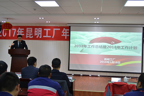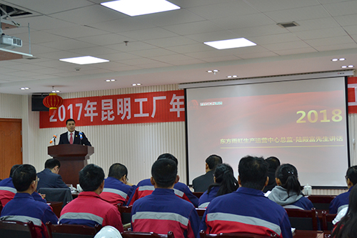 陸殿富先生作重要講話,他首先肯定了昆明生產(chǎn)基地在過去一年的變化與成長,隨后他要求生產(chǎn)基地全體人員要加強(qiáng)學(xué)習(xí),夯實(shí)各崗位的本領(lǐng),2018年昆明生產(chǎn)基地肩負(fù)重任,要從"產(chǎn)品質(zhì)量、成本管控、創(chuàng)新與成果"等方面進(jìn)行全面部署,希望生產(chǎn)基地全體員工腳踏實(shí)地,努力進(jìn)取,在2018年實(shí)現(xiàn)全面超越自我。