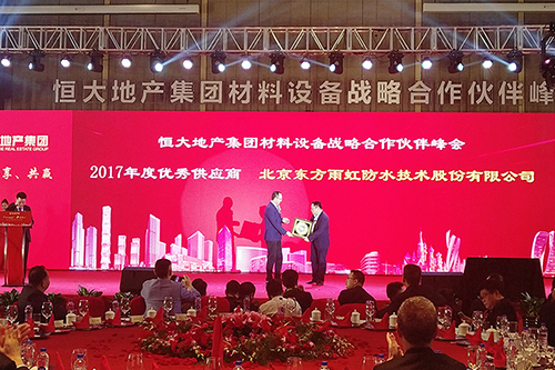 1月4日,由恒大地產(chǎn)集團(tuán)舉辦的2017年恒大地產(chǎn)集團(tuán)材料設(shè)備戰(zhàn)略合作伙伴峰會(huì)在深圳市南山區(qū)希爾頓酒店舉行。會(huì)上恒大對2017年作出重要貢獻(xiàn)的戰(zhàn)略合作企業(yè)進(jìn)行表彰,東方雨虹獲評“2017年度優(yōu)秀供應(yīng)商”榮譽(yù)稱號, 廣東東方雨虹董事長兼總經(jīng)理?xiàng)詈瞥沙鱿顒?dòng)并領(lǐng)獎(jiǎng)。
