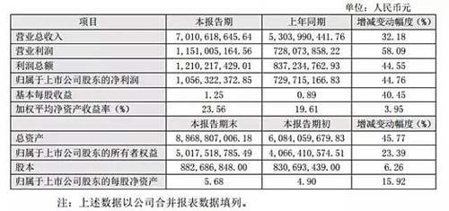二、經(jīng)營業(yè)績和財(cái)務(wù)狀況情況說明 報(bào)告期內(nèi),公司實(shí)現(xiàn)營業(yè)總收入7,010,618,645.64元,較上年同期增長 32.18%,主要系隨著公司品牌影響力不斷提升,產(chǎn)品銷量同比增長,材料銷售業(yè) 務(wù)和施工服務(wù)業(yè)務(wù)規(guī)模均有所增長所致;營業(yè)利潤1,151,005,164.56元,較上年 同期增長58.09%,利潤總額1,210,217,429.01元,較上年同期增長44.55%,歸屬 于上市公司股東的凈利潤1,056,322,372.85元,較上年同期增長44.76%,基本每 股收益1.25元,較上年同期增長40.45%,主要原因是報(bào)告期公司營業(yè)狀況整體向 好,主要產(chǎn)品的銷售收入、施工收入繼續(xù)增加,毛利潤逐步提高所致。 報(bào) 告 期 公 司 財(cái) 務(wù) 狀 況 良 好 , 截 止 2016 年 12 月 31 日 , 公 司 總 資 產(chǎn) 8,868,807,006.18元,較本報(bào)告期初增長了45.77%,主要是公司經(jīng)營規(guī)模擴(kuò)大所致。