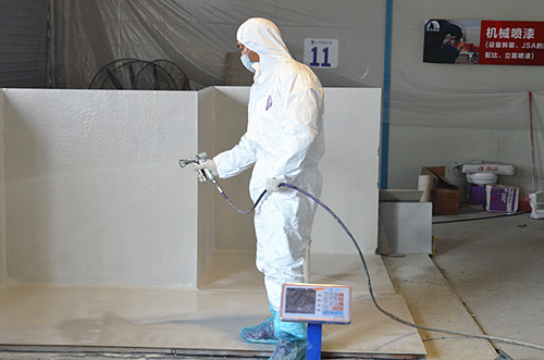 在緊張激烈的切磋技藝過(guò)程中,裁判員始終秉承公平公正原則,分別從施工時(shí)間、工藝標(biāo)準(zhǔn)、陰陽(yáng)角處理、管根做法、JSA攪拌、立面噴涂等主要節(jié)點(diǎn)來(lái)考核評(píng)比參賽選手對(duì)防水施工技術(shù)掌握情況。參賽選手們各顯其能,充分展現(xiàn)了過(guò)硬的技術(shù)本領(lǐng)和良好的精神風(fēng)貌,精湛的施工技術(shù)除了贏得在場(chǎng)參觀人員的一致好評(píng),還吸引了城建學(xué)院的領(lǐng)導(dǎo)和師生前來(lái)觀摩學(xué)習(xí)。