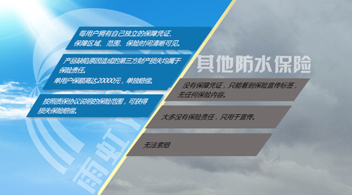 2016年4月7日,雨虹防水聯(lián)合專業(yè)的文津國際保險(xiǎn)經(jīng)紀(jì)公司歷經(jīng)109天推出防水行業(yè)保險(xiǎn)——雨虹家裝系統(tǒng)防水服務(wù)責(zé)任保險(xiǎn),保險(xiǎn)保障由中國人保承保。