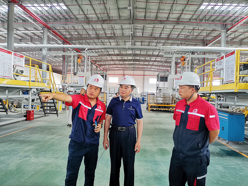 在東方雨虹廣州生產(chǎn)研發(fā)物流基地總經(jīng)理助理劉夢龍的陪同下,李院長一行參觀了高分子卷材車間。